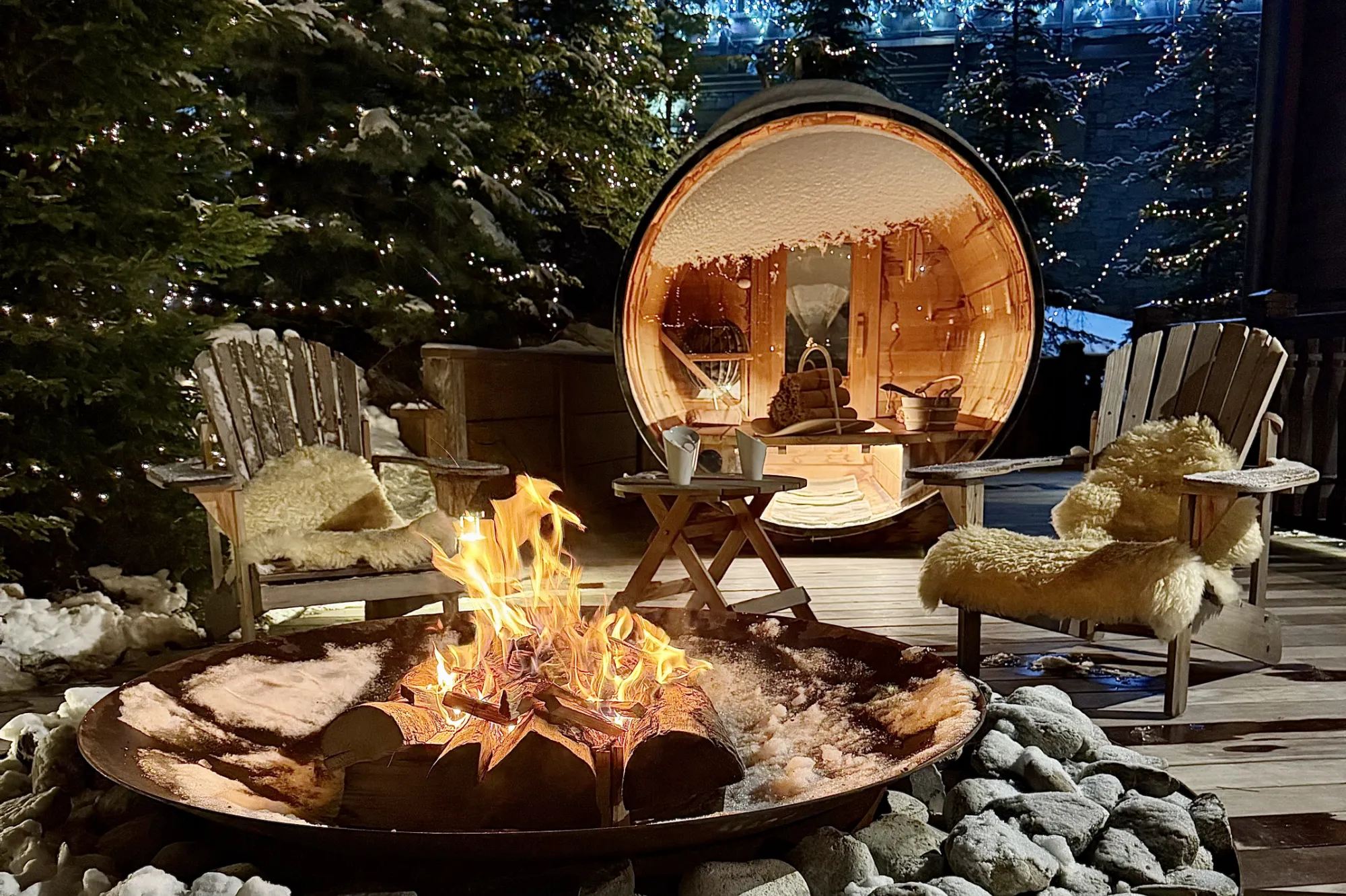 Prenez l’apéritif autour du brasero, sur la terrasse, alors que le soleil peint la montagne d’innombrables teintes allant du rose parme au bleu nuit.